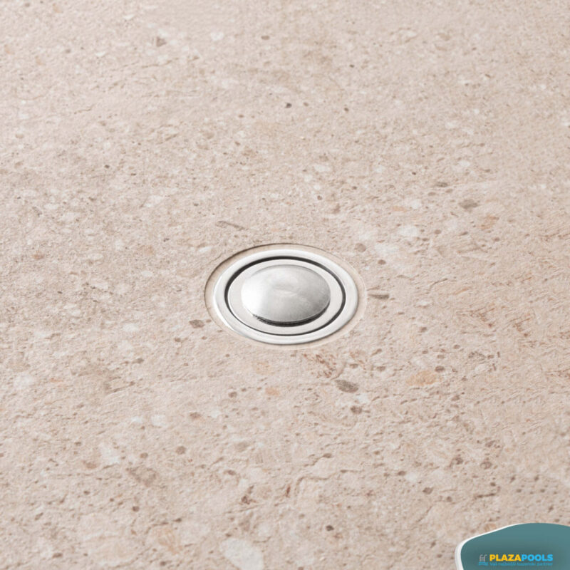 Izgled sidrišča z nameščenim klinom za bazensko pokrivalo, ko na njega ni pritrjen pas in bazen ni pokrit. Lečasta glava omogoča, da je ta element lahko nameščen celo leto, saj ni moteča in ne vpliva na hojo ob bazenu.